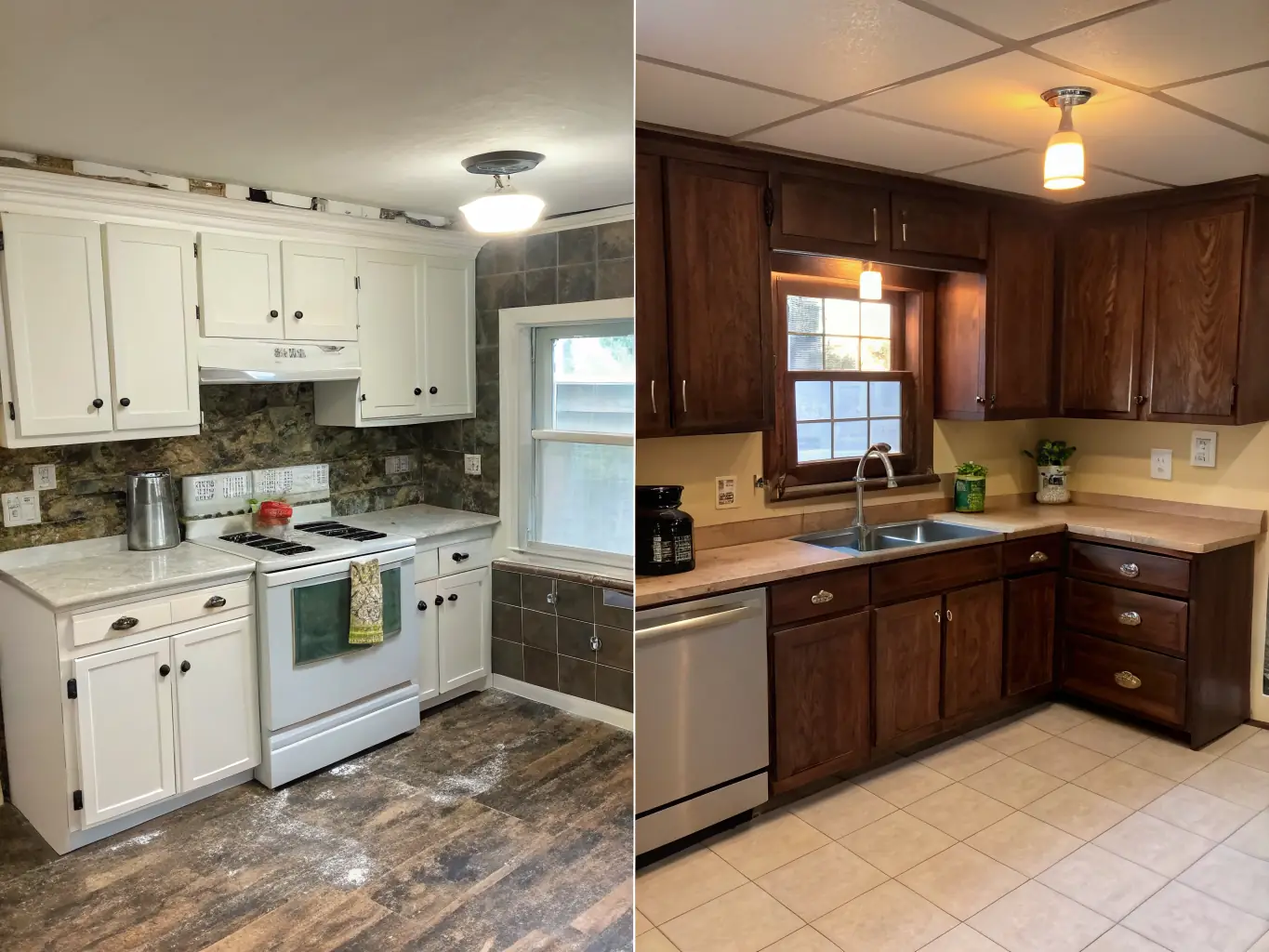 - Before: Dated kitchen with old cabinets.